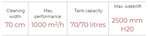 Self-contained, battery powered step-on extractor, 70 liters, two counter-rotating brushes, cleaning width 70 cm, 2x high waterlift three-stages 850W motors, very quiet running.