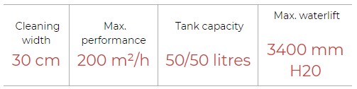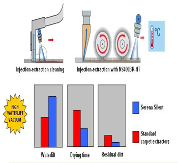 Serena-Silent is a particularly silent carpet extractor (60 decibel only!) with an excellent vacuum power, thanks to its three stages high-waterlift vacuum motor. Its high-waterlift vacuum system allows to recover the maximum quantity of dirt from carpet and to get a shortest drying time.